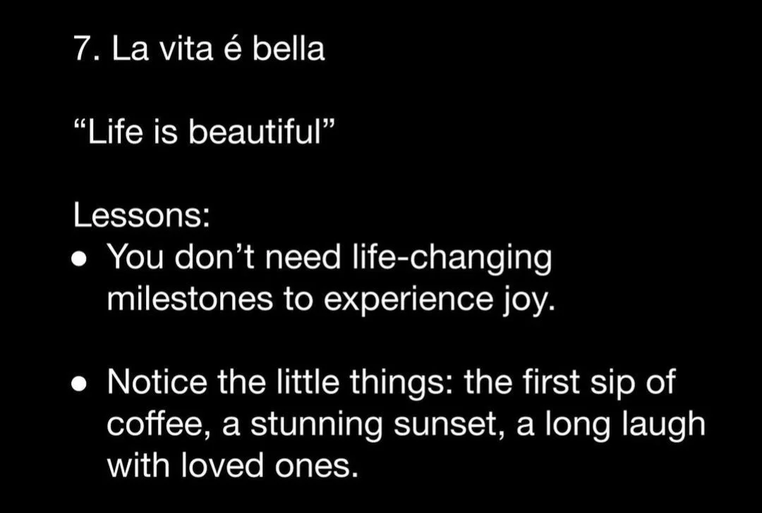A favourite quote of mine - La vita é bella - Life is beautiful - you don’t need life changing milestones to experience joy. Notice joy in the small things, such as a first sip of coffee, a stunning sunset or a long laugh with a loved one.